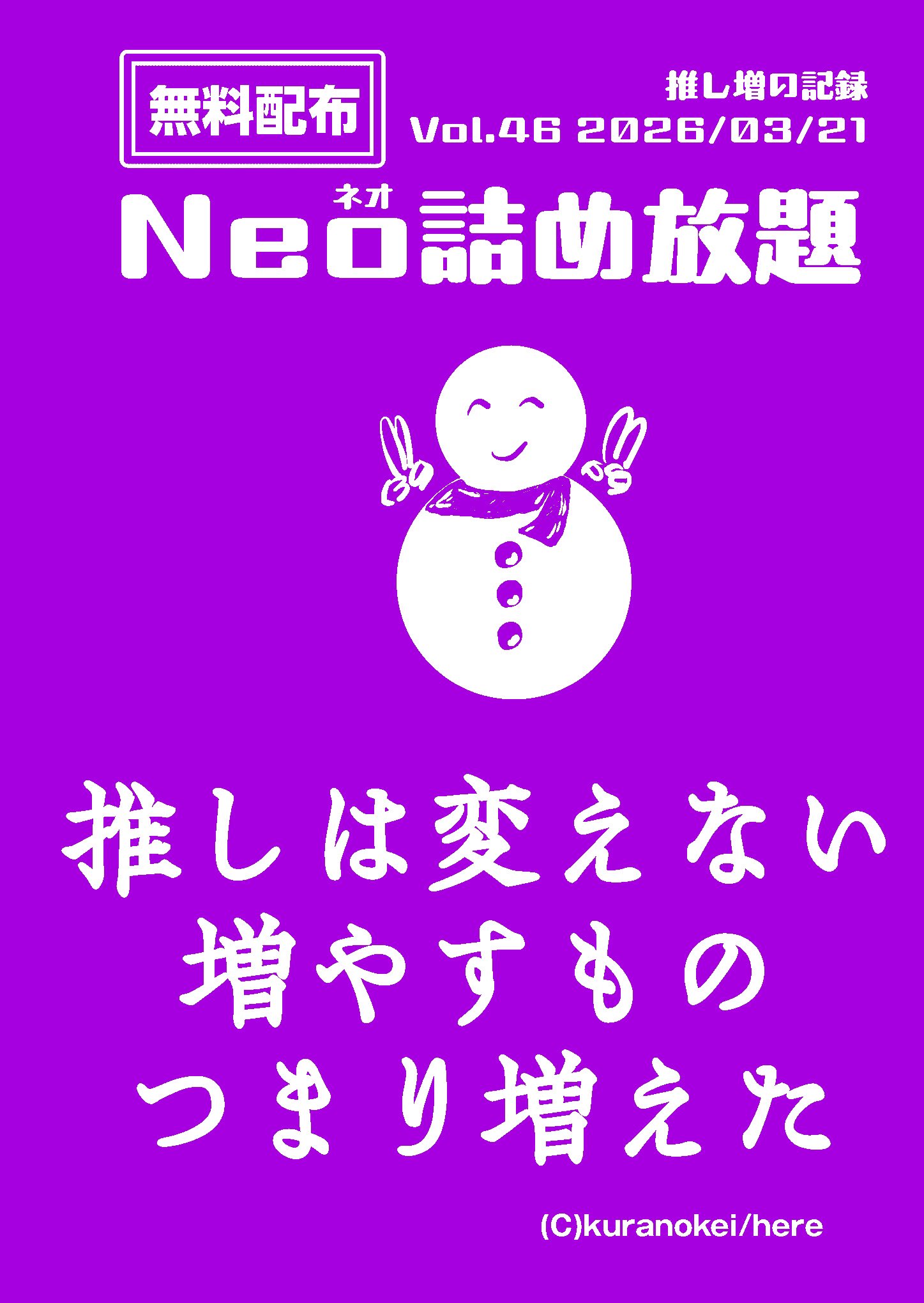 Neo詰め放題Vol.46 4P/A6(文庫サイズ)/¥0(無料配布) 2026/03/21頒布開始予定/推し活日記? イベントでの頒布、BOOTHで何か購入された方にお付けします。 |